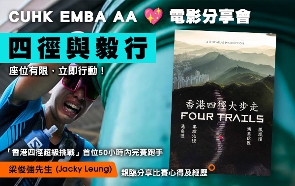 我們邀請到「香港四徑超級挑戰」(HK4TUC)首位在50小時內完賽的跑手🏆:梁俊強先生(Jacky Leung)親臨分享比賽🫶🏻心得及經歷,為今年3隊CUHK EMBA 毅行者隊打氣,請一同來觀賞這部滾動人心的紀錄片「香港四徑大步走」吧!🎉
